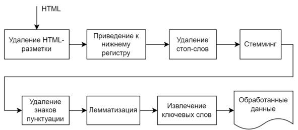 Как следует из рисунка 3, архитектура модуля предварительной обработки состоит из отдельных приложений, выполняющих удаление HTML-разметки, приведение к нижнему регистру, удаление стоп-слов, стемминг [103], удаление знаков пунктуации, лемматизацию, а также извлечение ключевых слов с использованием алгоритма TF-IDF [104].