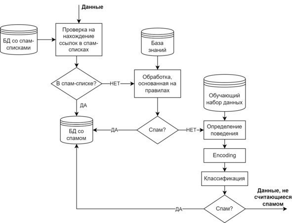 Следующим шагом является обработка на основе правил, в которой используются знания предметной области из базы знаний. Если данные определяются как спам, то они снова сохраняются в БД со спамом.