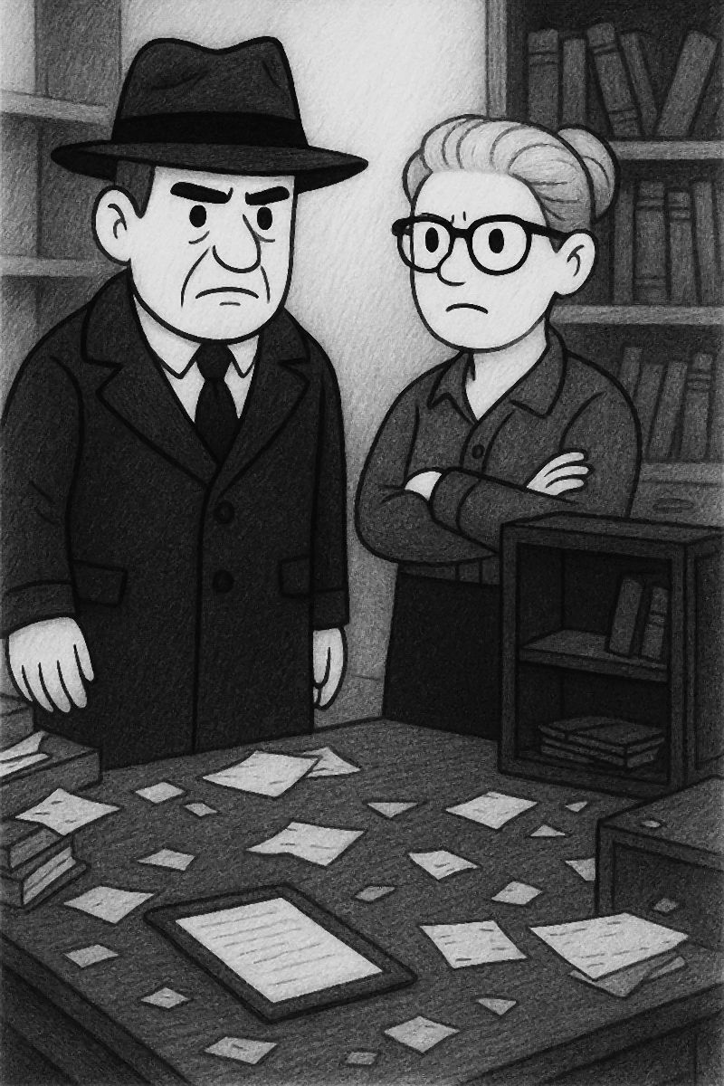 They go to her office. The office is messy: papers on the floor, dirty cups, books not on the shelves. It looks like someone was searching for something.