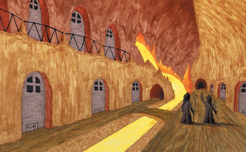 Над нами раскинулся высокий свод длинной прямой пещеры из камня каштанового цвета. За спиной была стена с бесконечной чередой дверей, ведущих в другие камеры. Тёмные высокие существа расхаживали перед строем узников по дороге, уходившей куда-то вдаль влево и вправо. С другой стороны дороги располагался пологий спуск к лавовой реке, текущей по дну пещеры. Она являлась единственным источником света в этом мрачном месте. От реки исходил сильный жар и запах серы. Местами через поток лавы были перекинуты мосты. Со сводов изредка капала вода и, испаряясь от раскалённой лавы, добавляла духоты. На противоположенном берегу лавовой реки была та же ситуация – длинный ряд дверей в камеры, строй заключённых и высокие тёмные существа с крючьями, из которых били молниеобразные разряды, если кто-то из людей выбивался из строя.