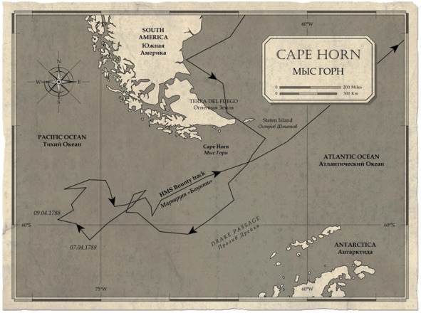 Можно не сомневаться: честолюбивый Уильям Блай принял решение разворачивать «Баунти» с тяжелым сердцем. Наверняка в глубине души он проклинал бюрократов Адмиралтейства, слишком поздно отдавших приказ стартовать из Портсмута. Наверняка он не ожидал, что погода на пороге Южных Морей окажется такой чудовищной. Наверняка он сетовал на элементарное невезение. Рухнула его тщеславная мечта – обогнуть пресловутый Мыс Горн и тем самым войти в престижный клуб навигаторов, покоривших это самое опасное для мореплавателей место на Земле.
