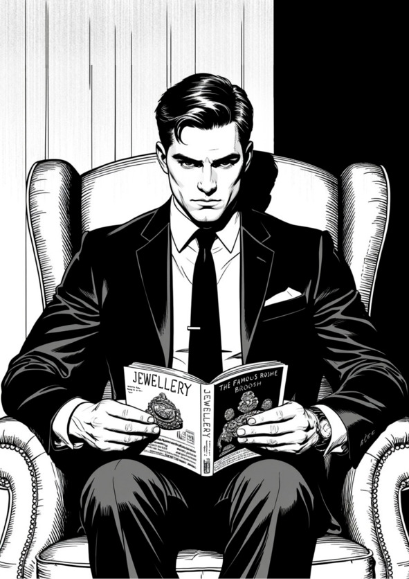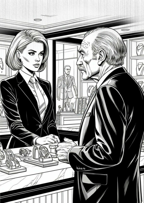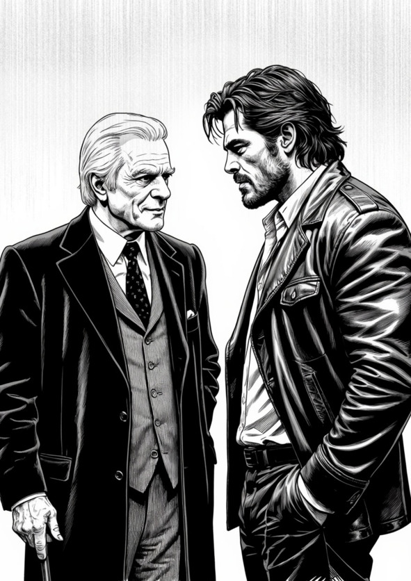 Позади него, едва различимая в полумраке, медленно вышла фигура – сухощавая, в длинном чёрном пальто. Его трость отстукивала глухие удары по полу. Лицо – словно высеченное из мрамора. Глаза – холодные, как лёд, взгляд – из тех, что пронизывают до самой души.
