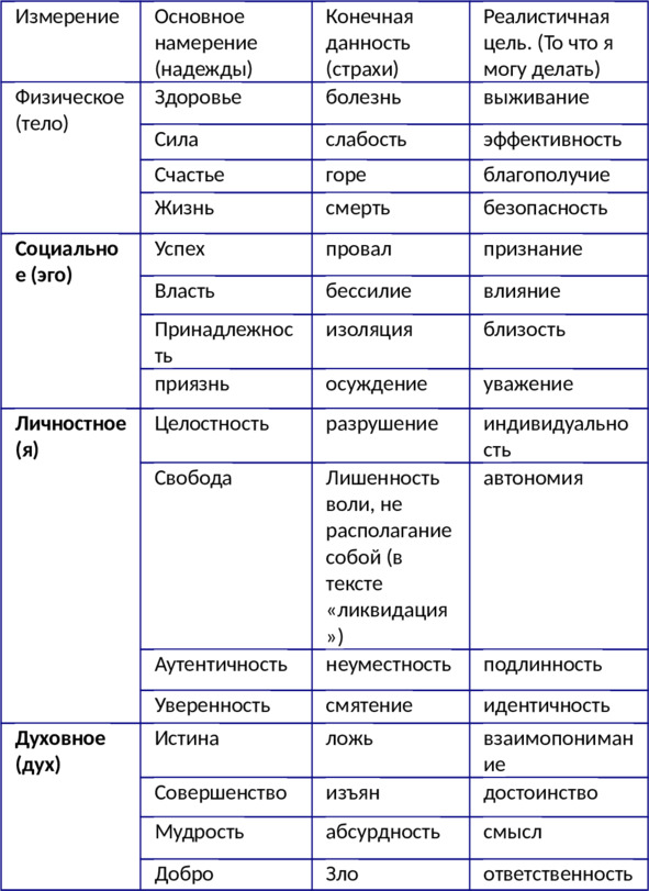 Каким образом люди фокусируют смысл своего существования в четырех сферах жизненного опыта? В данном случае смыслом является нахождение «операбельного» поля для своего намерения. То есть, что в данной ситуации может быть действительно сделано мной. Трезвое принятие решения на поле своих желаний, возможностей, и намерений других лиц, участвующих в данной ситуации. Намерение может быть обнаружено во всех четырех измерениях человеческого опыта, но решающим является сопоставление намерения с его теневой стороной, которая создает основную угрозу при нахождении смысла. Собственно, это и есть страхи, или то, что блокирует индивидуальную активность.