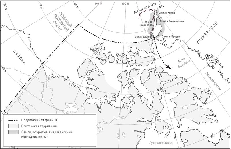 В ноябре 1874 года Дафферин известил британские власти о готовности канадского правительства включить в состав своей страны прилегающие к ней с севера территории. Сразу после этого Министерство по делам колоний приступило к определению точных границ передаваемых территорий. Однако результаты этой работы оказались неутешительными. Опираясь на доклад гидрографа Адмиралтейства и анализ этой информации сотрудниками его ведомства, Карнарвон в письме к Дафферину в январе 1875 года был вынужден признать: «кажется, что границы Доминиона в северном, северо-восточном и северо-западном направлении в настоящий момент совершенно не определены и невозможно сказать, какие британские территории ещё не присоединены к Канаде в соответствии с Указом-в-Совете[31] от 23 июня 1870 года о включении в состав доминиона всех территорий Компании Гудзонова залива, а также Северо-Западных территорий»[32]. Карнарвон попросил также выяснить Дафферина, устроит ли канадское правительство включение новых территорий через акт британского парламента. Возможно, самой важной частью в послании Карнарвона была приложенная к нему записка сотрудников его ведомства, попытавшихся определить границы передаваемой территории. На востоке её предлагалось ограничить Атлантическим океаном, Дэвисовым проливом, морем Баффина, проливом Смита и проливом Кеннеди. В отношении же северной границы и вовсе решено было пойти по самому простому пути. В условиях совершенной неопределённости таких границ было предложено считать таковыми «крайние пределы земель по направлению к Северному полюсу»[33].