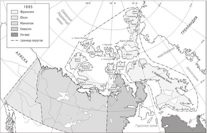 Ситуация начинает меняться в середине 1890-х годов. В 1895 году британский парламент принимает закон «О колониальных границах» (Colonial Boundaries Act), который разрешает менять такие границы через принятие Указов-в-Совете или через письма-патенты. Как результат – канадское правительство принимает 2 октября 1895 года собственный Указ-в-Совете об учреждении временных округов (Унгава, Франклин, Маккензи и Юкон), по которому арктические острова вошли в округ Франклин. Его южной границей была обозначена цепь проливов, отделявшая арктические острова от материковой части страны. Следуя с востока на запад по этим водным артериям до пролива Долфин-энд-Юнион, граница должна была достичь точки 125°30’ з. д. и около 71° с. ш., а оттуда двигаться сначала на север, а потом на северо-восток до самой северной точки, достигнутой в ходе экспедиции Дж. Нэрса 1876 года, то есть до 63°30› з. д. и 83°15› с. ш. Далее граница опять поворачивала на юг (см. карту 3).
