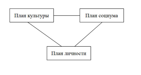 Пятый блок модели – «интерпретационная схема» – в латентной форме содержится внутри триады – культура-социум-личность, то есть распределен среди всех трех блоков трех-местной модели. И действительно, способ интерпретации текста культуры содержится, как в самом тексте, так и в других текстах, а, в какой-то мере, в способе обращения с текстом, который передается по механизму культурной традиции. Таким образом, несет в себе и интерпретационную схему, без которой невозможно использование (чтение, понимание, создание) текстов культуры. Но и также несет в себе эту схему, хотя и иным способом. Интерпретация текста – функция живой человеческой личности. И эта интерпретация зависит от человека, от его культурного развития, культурной принадлежности, от его душевного настроя, наконец. Возьмем третий блок – «план социума». Очевидно, что способ культурного взаимодействия людей не только предполагает использование тех или иных текстов, но и непосредственно представляет собой способ их интерпретации. Таким образом, выделение пятого блока в самостоятельную единицу определяется исключительно нашими исследовательскими задачами. Модель – всего лишь теоретический инструмент, который может быть сконфигурирован тем или иным способом в зависимости от задач, решаемых нами. план культуры план личности