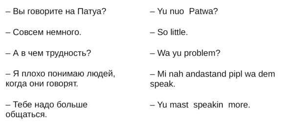 Jamaican Patwa не сформировался полностью как литературный язык, поэтому единые грамматические нормы как написания, так и произношения – отсутствуют.