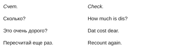• Alligator lay egg, but ’im noh fowl —– крокодил тоже откладывает яйца, хоть он и не птица.