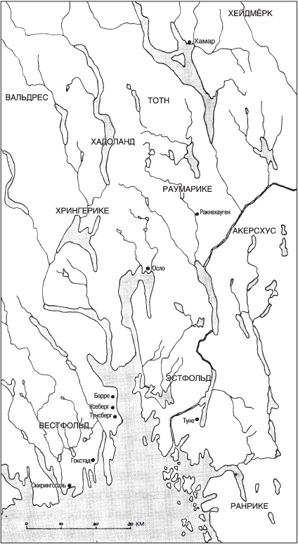 К концу V в., когда завершилась эпоха переселения, к югу от Халогаланда существовало множество отдельных сообществ: их членов объединяли общие интересы, совместное судопроизводство, и отправление религиозных обрядов, и верховная власть некоторого правителя, каким бы титулом он ни назывался. Городищи, разбросанные по всей территории Норвегии и Швеции и датируемые 400–600 гг., – наглядное подтверждение того, что людям приходилось защищать себя и свои земли силой оружия, а это неизбежно вело к усилению власти военных вождей. Прибыль от торговли и богатые залежи железа, которое можно было превратить в ремесленные или сельскохозяйственные приспособления или оружие, доставалась самым сильным, решительным и алчным. Повсюду находились люди или целые семейства, выделявшиеся среди других богатством, обширными владениями, воинским искусством, разбойной удачей или просто всепобеждающим стяжательством. Добром или силой они добивались от своих соседей покорности и поддержки, предоставляя им взамен покровительство и защиту. Их властью совершались обряды и исполнялся закон. Иногда эти местные властители – конунги или ярлы – договаривались о некотором обязательном кодексе поведения, служившем на благо всего сообщества. Для начала из нескольких соседских семейств возникали простейшие административно-территориальные объединения bygS (дат. by) – поселения. Чтобы как-то регулировать отношения внутри bygS, требовался специальный орган. Эту роль исполнял тинг, следивший за соблюдением законов и защищавший права свободных людей. На тинге разбирались распри, назначалась вира или выносилось решение о признании виновного вне закона. Несколько bygSir нередко объединялись для обороны и судопроизводства; эти более крупные территориально-политические образования (пёгаб, fiorSungr, fylki и т. п.), в свою очередь, составляли «королевства», в названиях которых часто присутствуют элементы – rike, – land, – mark, указывающие на их происхождение. В эпоху викингов правителям Вестфольда удалось собрать из этих разрозненных мелких королевств некое подобие единой Норвегии.
