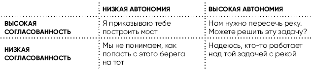 В таблице 1.2 показано, как взаимосвязаны согласованность и самостоятельность. Низкая согласованность и автономия приводят к путанице, нежеланию работать и плохим результатам. В коллективе с высокой согласованностью, но низкой автономией, например в армии, люди делают то, что им говорят, но зачастую не более того. В компаниях с низкой согласованностью и высокой автономией, как во многих консалтинговых фирмах, сотрудники делают то, что лучше для их команды, но не всегда делятся важной информацией.