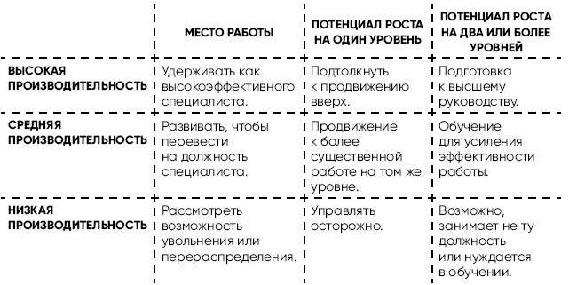 Со временем процесс планирования замен трансформировался в систему управления преемственностью. Лидеры промышленности, такие как GE и General Motors, начали использовать специальные инструменты для определения кандидатов на замещение ключевых позиций. Одним из наиболее известных примеров стала популярная матрица девяти квадратов, или матрица потенциала, показанная в таблице 2.1.