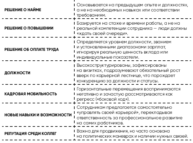 Вот примеры: наем сотрудников исключительно на основании предыдущего опыта, продвижение по карьерной лестнице с использованием фиксированных должностей и уровней, а также оплата труда в зависимости от должностных окладов (см. таблицу 2.2). Эти подходы требуют пересмотра.