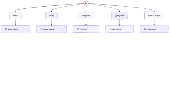 Это упражнение помогает буквально «увидеть», откуда у вас определённые установки. Оно работает как системная расстановка на бумаге – вы замечаете, какой стиль отношений с деньгами был в вашей семье, и какие его элементы живут в вас до сих пор.