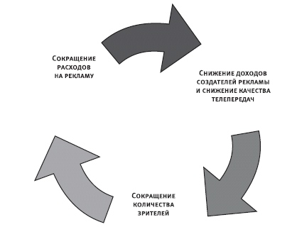 Анализируя корни проблемы, можно увидеть, что телевидение само страдает от проблемы, которую можно представить в виде нисходящей спирали (рис. 4.1). Сокращение количества телезрителей ведет к снижению объема инвестиций в рекламу, а это, в свою очередь, перекрывает креативный кислород контенту, потому что снижаются доходы талантливых создателей рекламы. В результате снижения качества передач количество зрителей продолжает уменьшаться – чем глубже тонет корабль, тем больше крыс с него бежит… В общем, вы поняли мою мысль.