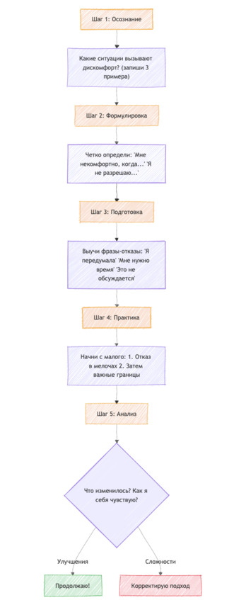 Выстраивание границ – это навык, который требует практики и времени. Иногда ты будешь сомневаться или бояться сказать правду, но каждый такой шаг помогает стать увереннее и сильнее. Помни, что уважение к себе – это основа любых здоровых отношений.