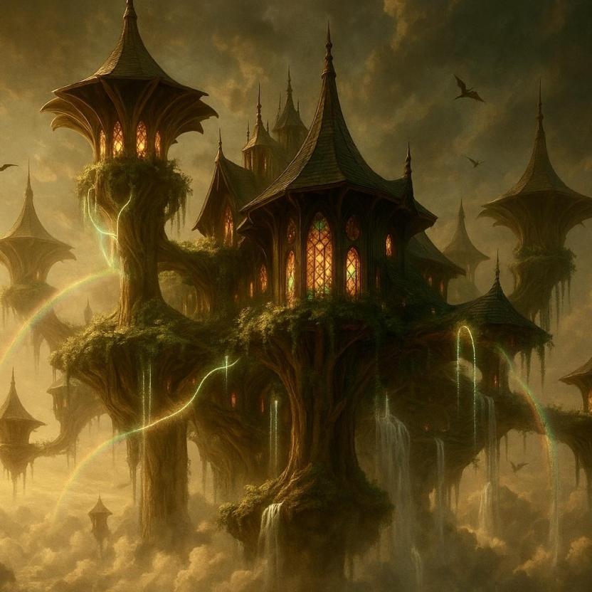 Мосты из радужного тумана соединяли здания. Поражали воображение огромные, витые колонны, похожие на стволы древних дубов, уходящие в облака и поддерживающие целые сады, висящие в воздухе. Вода струилась по серебряным желобам, превращаясь в сверкающие водопады, которые терялись в облачной дымке внизу.