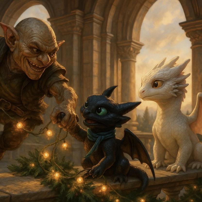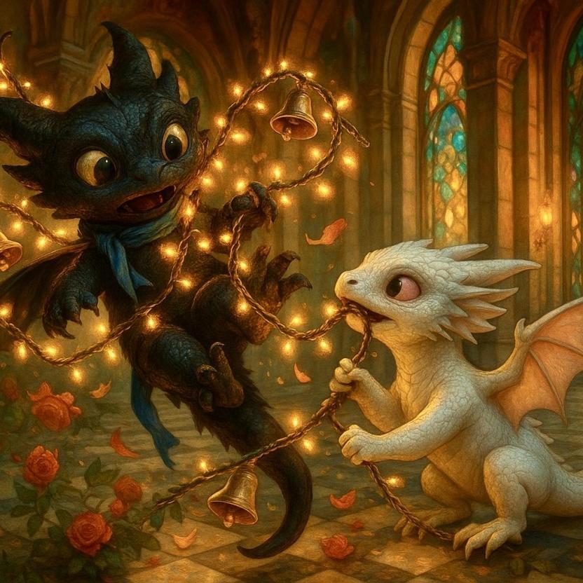 Йоша, маленькая дракоша, несла огромную, почти с нее размером, стопку писем, видимо, почтовый десант для новичков. Увлекшись, она не заметила низко свисающую гирлянду из светящихся бусин и колокольчиков.