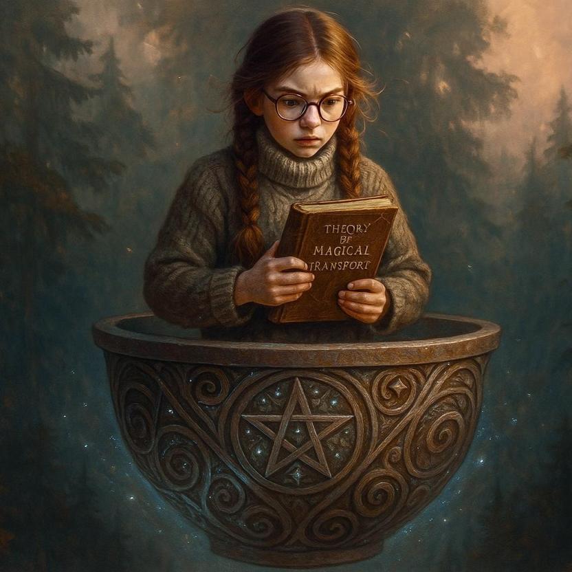 Эля, полет над деревней.Дуббон Эли был идеально гладким, без единой шероховатости, с геометрически точной резьбой – спиралями и точками, напоминающими звездные карты. Эля с её идеально уложенным рюкзачком и стопкой конспектов «О возможных основах магического транспорта у восточных славян (теория)» загрузилась в дуббон.
