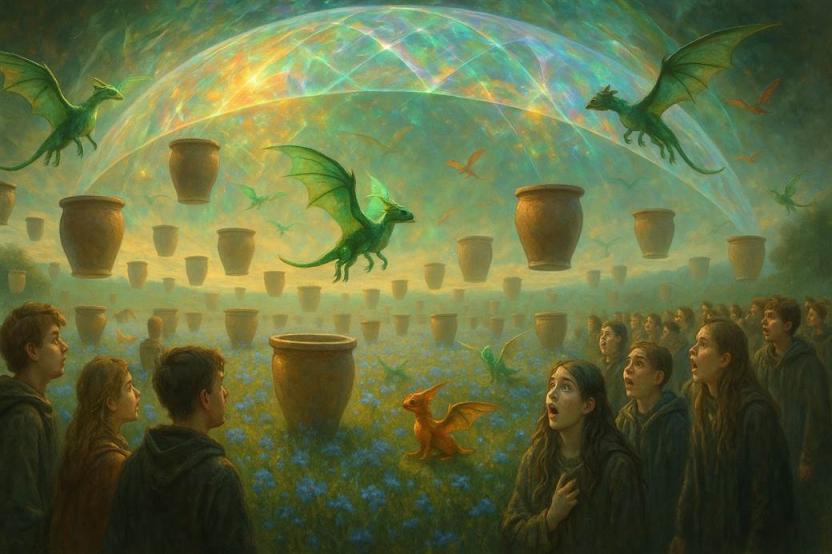 Она открылась им внезапно, как дверь в другой мир. Посреди бескрайнего, высокогорного луга, усыпанного цветами невероятной голубизны, стояли десятки дуббонов. Они тихо покачивались в воздухе, будто лодки на невидимой волне. Над поляной висело странное, переливающееся сияние, как отражение огромного хрустального купола. Воздух звенел от смеха, возбужденных голосов и… фырканья дракош всех мастей и расцветок.