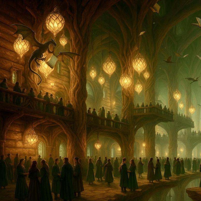 Вместо люстр – гроздья светящихся плодов, похожих на хрустальные яблоки или диковинные ягоды, медленно покачивающиеся в невесомости. Воздух звенел от смешанного шума: голоса студентов, щебет дракош, шелест невидимых страниц, отдаленный звон колокольчиков и… ароматы. Ароматы выпечки, диковинных трав, свежего сена, воска и чего-то неуловимо домашнего, уютного.