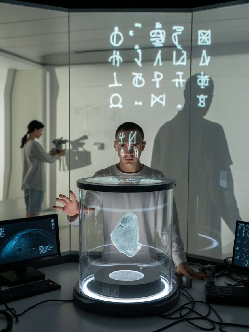 Максим подошел ближе к артефакту, завороженный игрой света внутри кристалла. Символы на поверхности, казалось, двигались, плавно перетекая из одной конфигурации в другую. Но самое удивительное происходило внутри – там формировалась трехмерная структура, напоминающая голограмму, но более сложная, более… реальная.