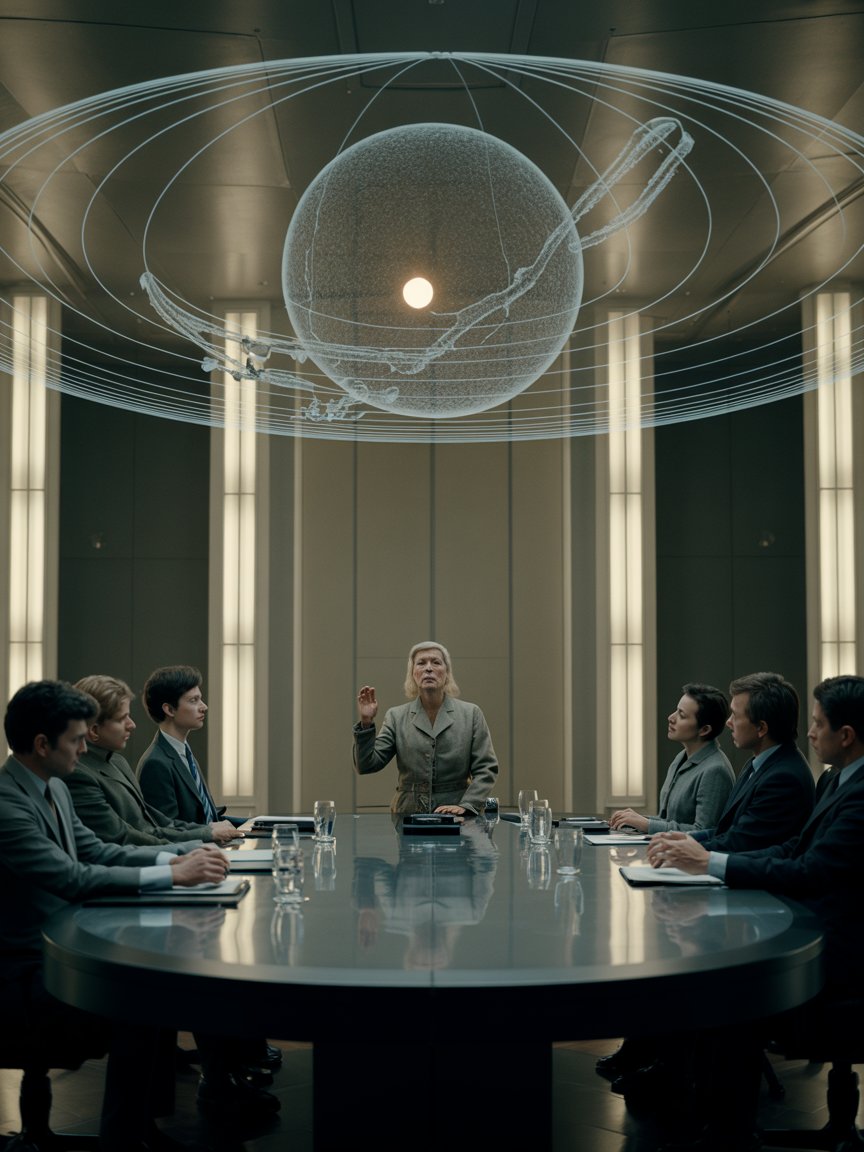 Алекс молча кивнул и последовал за ней через просторное фойе комплекса. Они прошли мимо величественной голографической проекции галактики Млечный Путь, миновали несколько контрольно-пропускных пунктов с биометрической идентификацией и наконец оказались перед массивными дверями конференц-зала.
