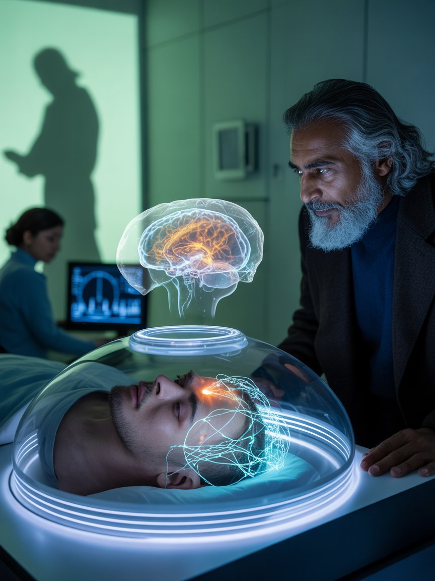 – Нейроинтерфейс нового поколения, – объясняла Анна, прикрепляя последние датчики. – Он считывает не только электрическую активность мозга, но и квантовые состояния нейронов. Это позволит нам более точно направлять и стабилизировать твоё сознание во время перехода.