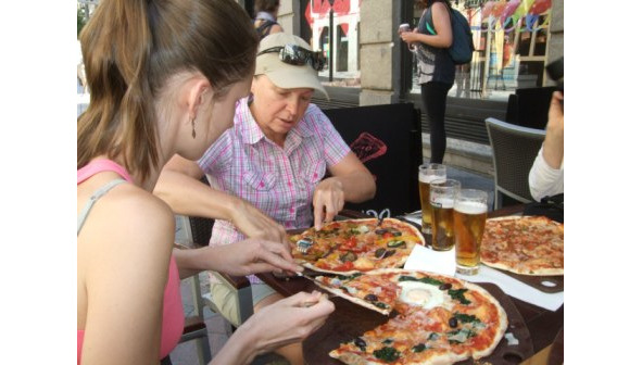 Я и Женя Задруцкая в уличном кафе делимся каждая своей пиццей. Мадрид, 22.08.2014. Фото Дмитрия Задруцкого.