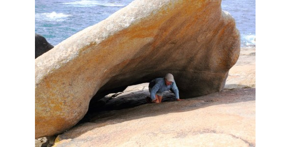 Барка – изогнутый камень на берегу Атлантического океана в Муксии. Я, отдавая дань традиции, проползаю под легендарным камнем, считающемся окаменелой лодкой девы Марии. 22.09.2014. Фото И. Захарова.