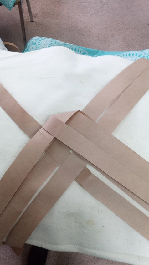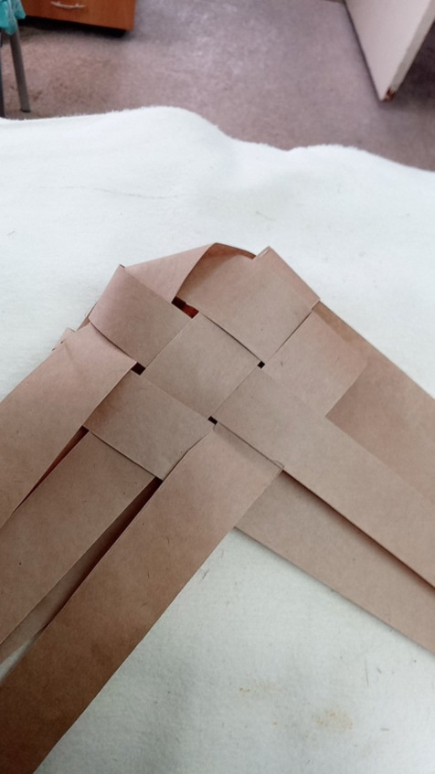 Затем берём третью лычку справа и третью лычку слева и перегибаем её на 90°, в строку своей парной лычки с которой они перекрестились в нашем месте перегибки