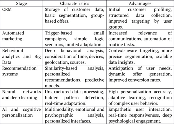 Thus, before entering the modern stage, personalization evolved from behavior prediction to contextual and empathetic adaptation based on a deep understanding of the individual (table 2) [21].