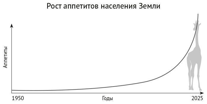 Что случилосьВроде бы ничего особенного, но после Второй мировой войны население планеты утроилось. Каждому из 8 023 914 450[7] живущих на Земле (на момент написания главы) нужно есть, пить, одеваться. Так получилось, что наши аппетиты стали стремительно расти, потребление природных ресурсов увеличилось уже не в три, а в десять раз[8]. Потребовалось в два раза больше земель, в пять раз больше воды и энергии и в четыре раза больше зерна. График происходящего выглядит так, как если бы удав из «Маленького принца» ещё не до конца переварил слона, но уже проглотил жирафа.