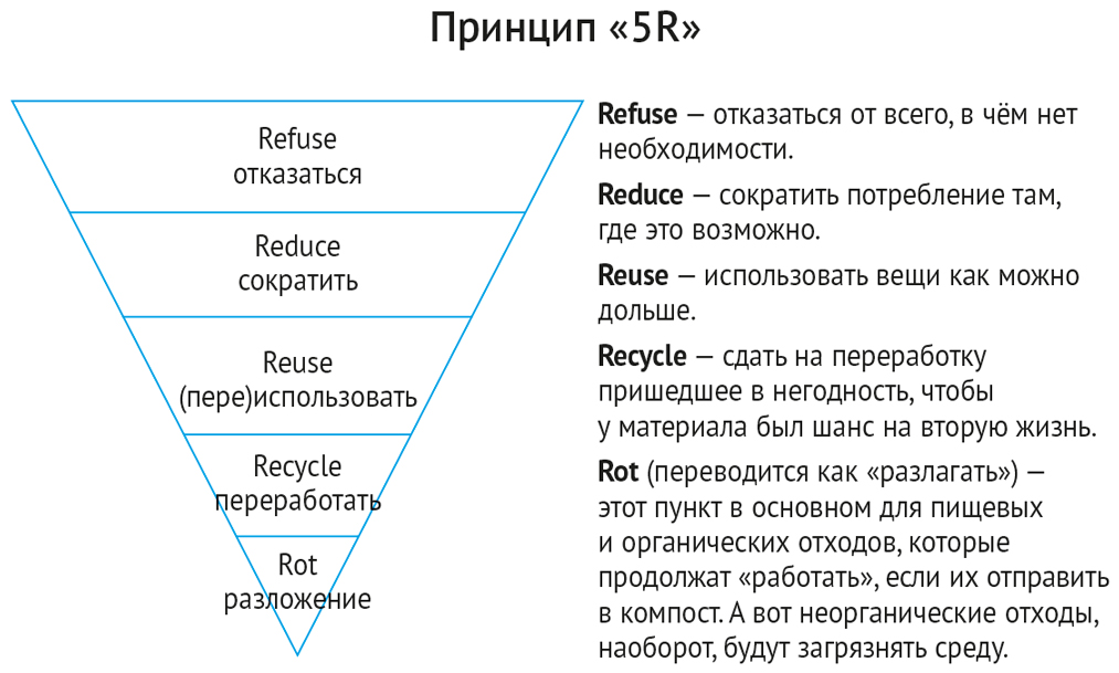 Принцип «5R» получил известность благодаря Беа Джонсон, наверное, самой известной в мире активистке, продвигающей стиль жизни «ноль отходов», автора блога и книги «Дом без отходов»[22]. Ей удалось сократить расходы семьи (она сама, её муж, сын и пёс) до 40 % и отходы за год – до одной литровой банки мусора. Часть принципов «R» появилась ещё в 1980-х, во время одной из первых общественных кампаний, призывающих к сокращению отходов. Это были принципы reduсe («сократить»), reuse («переиспользовать») и recycle («переработать»). Книга Джонсон вышла в 2013 г., и концепция «5R» в ней была сформулирована в том виде, в каком мы её знаем сейчас, – перевёрнутый треугольник с пятью «R».