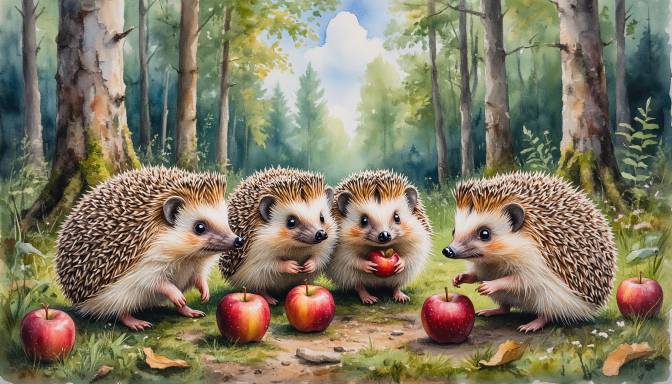 Лето подходило к концу, и наступила пора делать запасы на зиму. Пошли как-то ежата на прогулку и увидели на краю оврага огромную яблоню. А под ней – целое богатство! Румяные яблоки, наливные груши и даже несколько спелых слив лежали в мягкой траве.