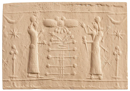 Цилиндрическая печать с изображением двух божественных фигур перед сакральным деревом. Месопотамия, VIII–VII вв. до н. э.
