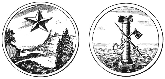 Каталог Symbola et emblemata, изданный в 1705 году, откуда брали изображения для фейерверков. Скорее всего, фейерверк 1711 года изображал похожую звезду и столб с ключом и палашом.
