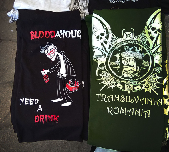 Помимо перечисленного, румынская сувенирная промышленность предлагает такие знакомые и милые сердцу вещи, как футболки с весёлыми надписями (например, «Bloodaholic») или кофейные кружки с рецептом «коктейля Дракулы». С удовольствием поделюсь секретом приготовления с заинтересованными: смешайте 50 мл крови группы А, 50 мл крови группы В, 10 мл крови группы АВ, добавьте чуть-чуть минеральной воды и сверху дольку лимона. Натуральный продукт, подходит для низкокалорийной диеты!