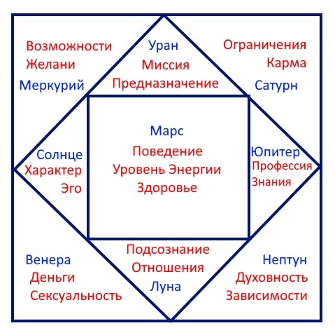 Нижний уровень Квадрата занимают Женские Планеты – Венера, Луна и Нептун.