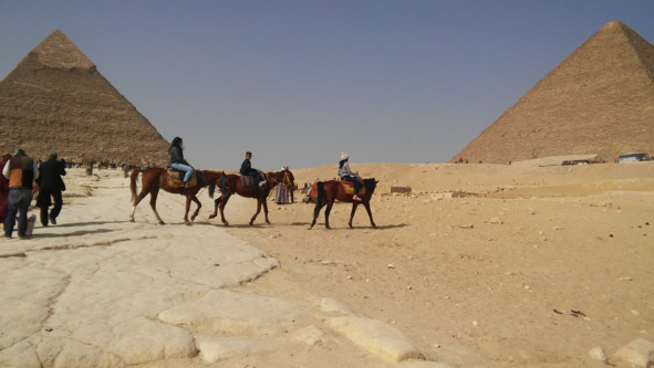 Площадь перед пирамидой поразила меня шумом, движением машин, верблюдов, лошадей, повозок и людей. Я почувствовала себя на съемках фантастического фильма. Здесь смешались века и культуры. Давно знакомая по картинкам и фильмам пирамида притягивала к мне себе, как магнит. Мы обошли вокруг пирамиды Хеопса.