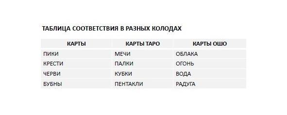 В таблице соответствия мастей в колодах карт показано, что пики – это мечи, крести – это палки, черви – это кубки, бубны – это пентакли. Кубки (черви) означают любовь, отношения. Палки (крести) показывают дела. Мечи (пики) – это препятствия, порчи, враги. Пентакли (бубны) показывают деньги.