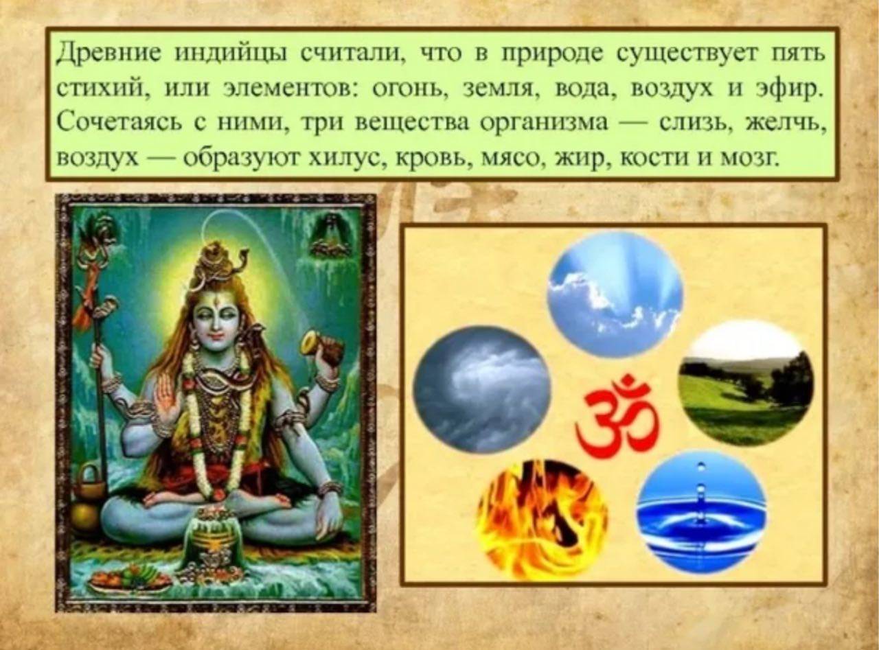 В основе творения лежат пять агрегатных состояний материи, так называемы пять великих элементов (Панча-Маха-Бхута). Эти пять элементов соединяются между собой и формируют три доши (три недостатка), которые лежат в основе конституции тела.