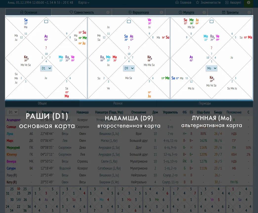 В данной натальной карте Д1 под цифрой 5 находится 8-ой дом в знаке Льва, в Навамше Д9 тоже в знаке Льва, в Лунной карте в знаке Тельца цифра 2.