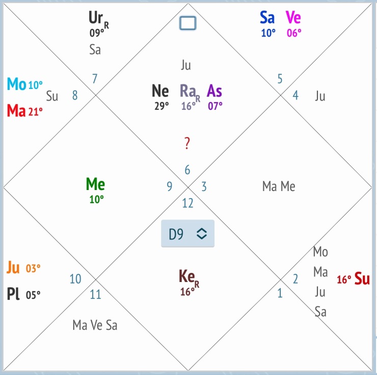 Так же в гороскопе Д9 хозяин 7 дома является падающей планетой, т.е. поражён. Все это маленькими шажками и приводит к большой трагедии.