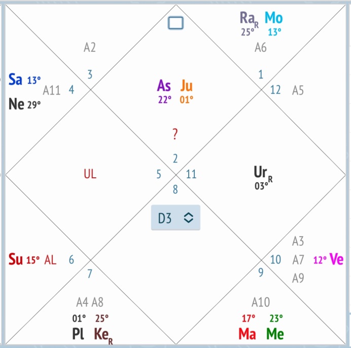 В гороскопе Д3 важно отметить, что 3-ий дом – это 8-ой от 8-го, в нём Сатурн является йога-каракой, но испытывает аспект Марса из 8-го дома, что говорит о несчастном случае в период Сатурна или Марса.