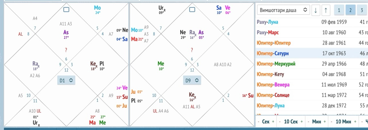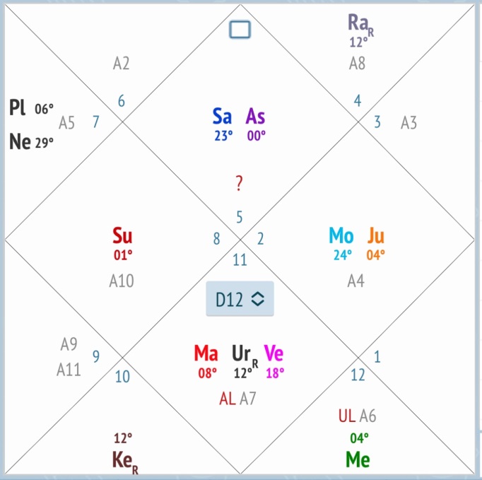 В гороскопе Д12 – это деление каждого знака зодиака на 12 частей, Сатурн находится в 1-ом доме и является хозяином 6-го дома несчастных случаев, что приносит энергию 6-го дома в первый. Обратите внимание на 8-ой дом в гороскопе Д12, там Меркурий находится в падении. Это сокращает продолжительность жизни.