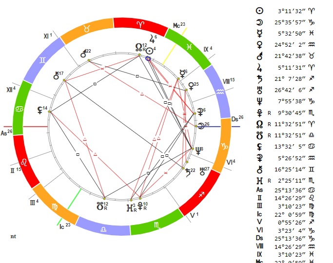 Юпитер является хозяином 8-го дома смерти и дает аспект на хозяина 1-го дома своим 7-ым аспект от себя. Угрожающие комбинации, словно мрачные мелодии, повторяются с небольшими вариациями раз за разом.