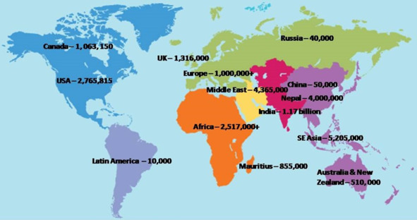 Однако индийцы живут по всему миру. Это 27 млн. примерно 0,9% от общей численности населения страны. Индийская диаспора (Рис. 6) -одна из самых крупных в современном мире. Первая большая волна эмигрантов была, в основном, в XIX веке, вторая волна в 1960-х г.г.– 3 млн.