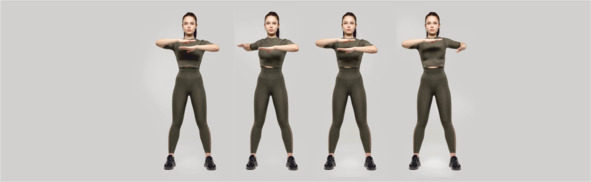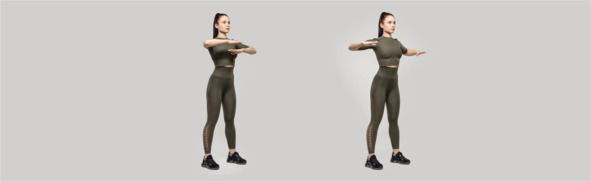 Исходное положение – стоя, руки согнуты перед грудью в локтевых суставах. В исходном положении вдох, на выдохе левую руку, согнутую в локтевом суставе, отводим назад и возвращаемся обратно в исходное положение. Снова вдох, на выдохе правую руку, согнутую в локтевом суставе, отводим назад и возвращаемся обратно в исходное положение. Темп средний. Выполнить 4-6-8 раз.