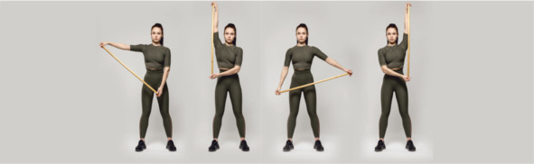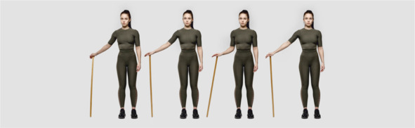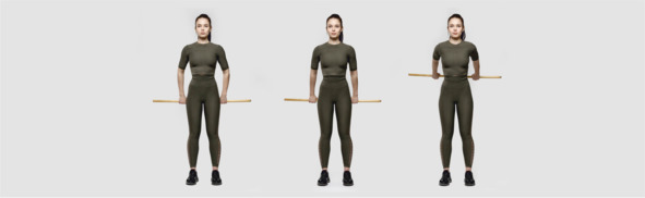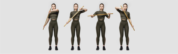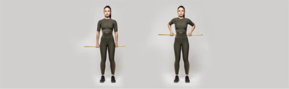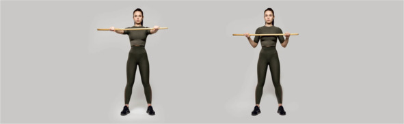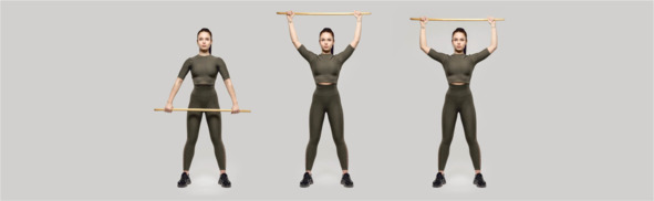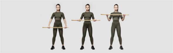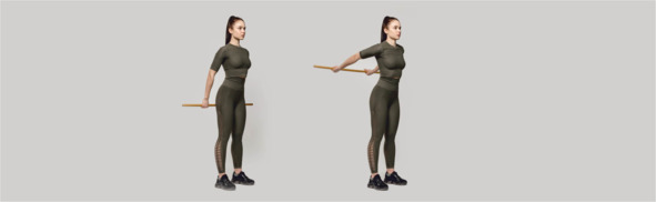 Исходное положение – стоя, руки на ширине плеч, палочка в руках сзади. Отведение рук назад до возможной амплитуды. Болевые ощущения при выполнении упражнения не допускается. Дыхание произвольное. Темп средний. Выполнить 4—6 раз.