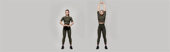 Исходное положение – стоя, ноги на ширине плеч, пальцы сложили в замок. Поднимаем руки вверх, ладони развернули к потолку – вдох, потянулись руками вверх (на носки не поднимаемся, вверх не смотрим). На выдохе опустили руки, сделали небольшой наклон туловища вперед, руки расслабили, голову наклонили, шею расслабили. Темп медленный. Выполнить 3—4 раза.